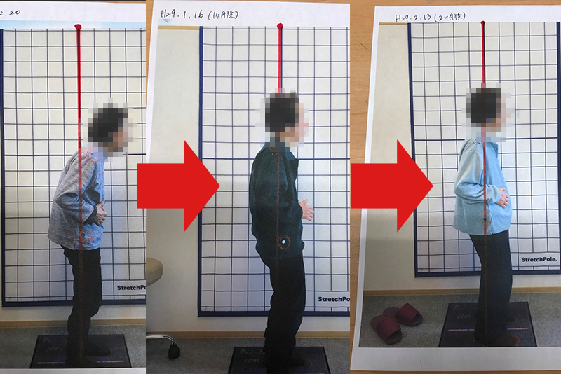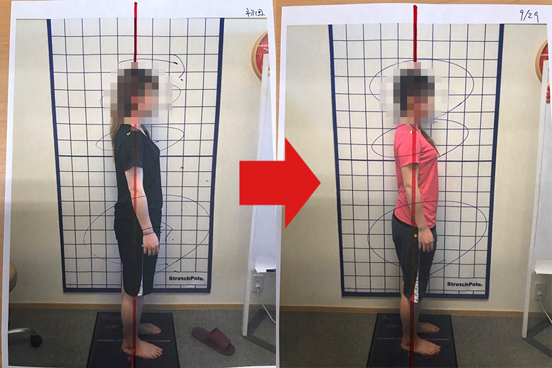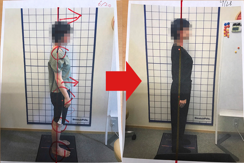 初診時の施術前の写真と、その患者にとって必要なクール数来院を続けた後の施術前の写真を比較したビフォアビフォア写真です。つまり、治療計画通りに通ってもらうことで、どれだけ姿勢が根本的に改善したのか?を表しています。